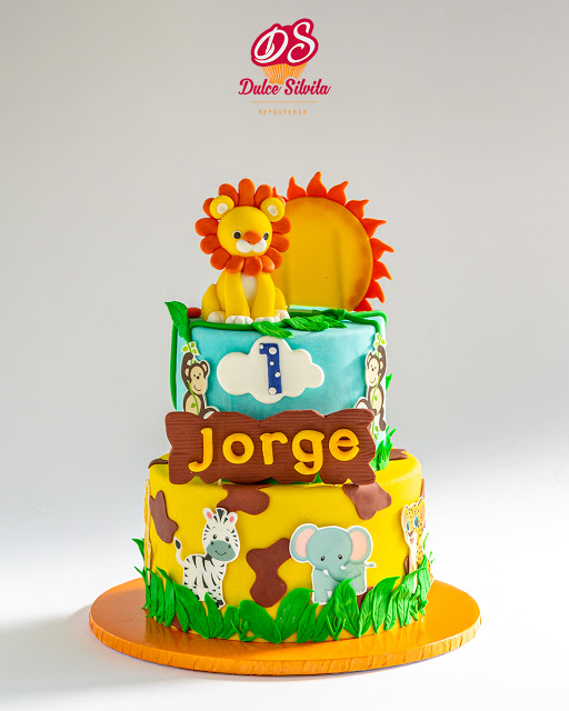 Para el pequeño Jorge en su primer cumpleaños esta hermosa y colorida tarta con sus animales de la selva favoritos.