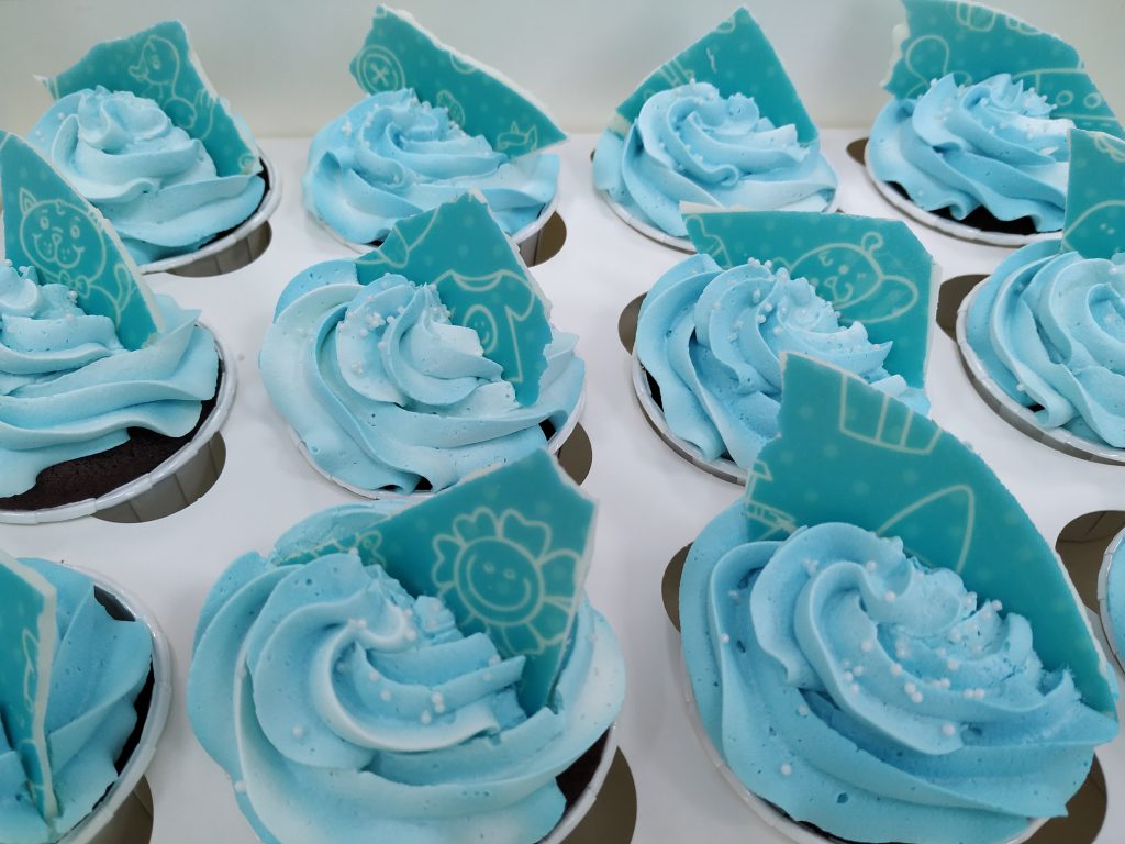 Para acompañar la mesa dulce estos cupcakes con decoraciones de chocolate personalizada.