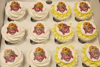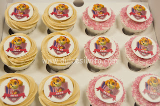 Para completar una mesa dulce nos encargaron 2 docenas de Cupcakes con Skye, la simpática perrita de Patrulla Canina, y 2 docenas de Galletas con el mismo personaje.