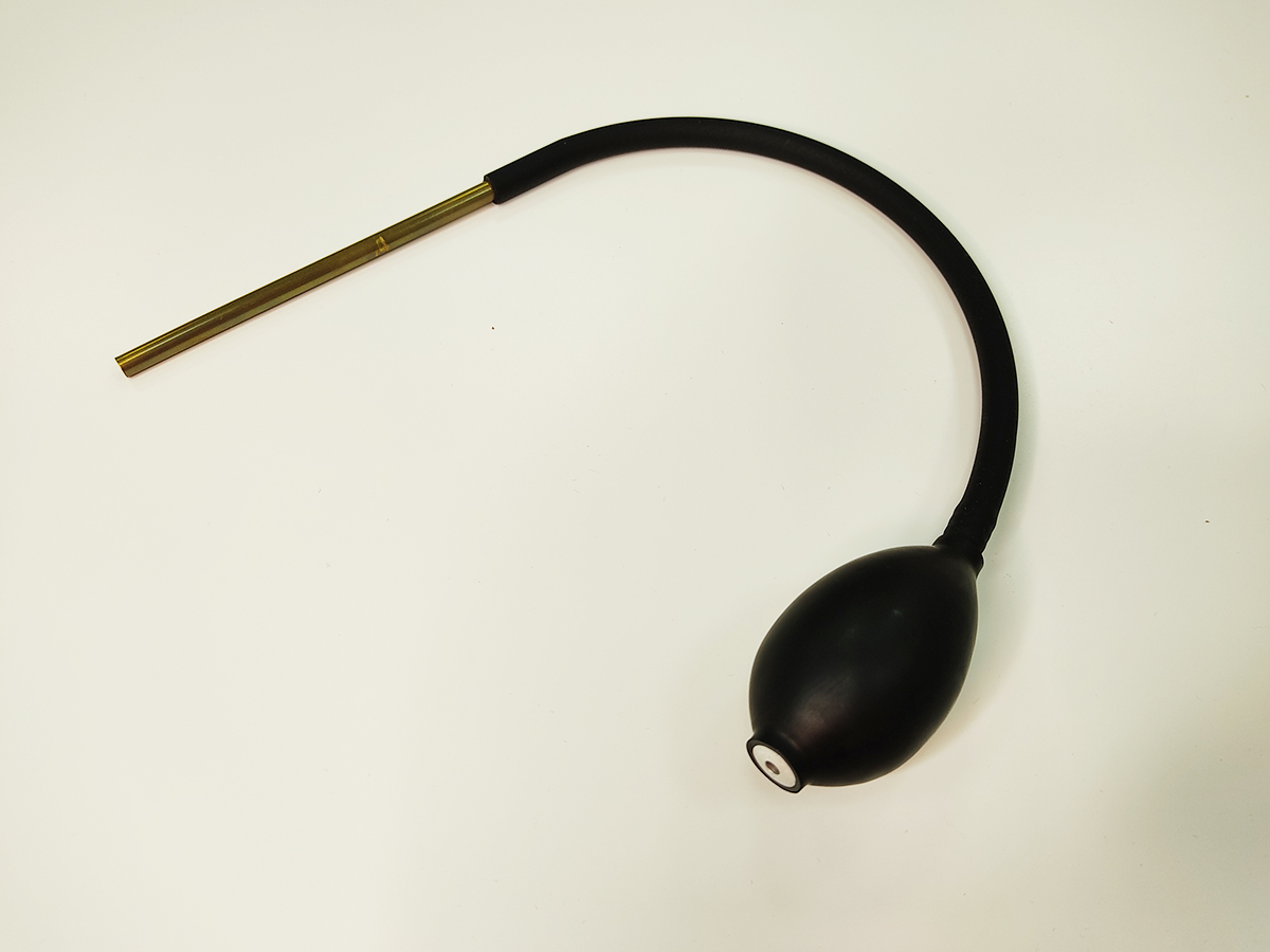 La bomba de suflado o soplado de azúcar es una herramienta indispensable en el trabajo con isomalt ya que permite introducir aire en el caramelo para crear figuras y esferas.