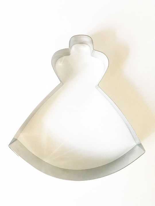 Cortador de acero inoxidable con forma de vestido percha.