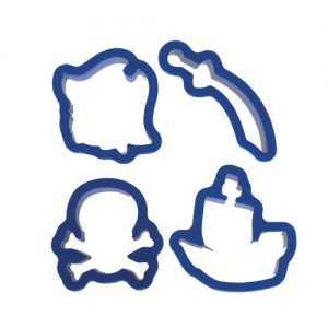 Set de 4 cortadores de plástico, con forma de pirata, barco, espada y calavera.