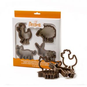 Set de 4 cortadores de plástico, con forma de gallina, vaca, burrito y oveja.