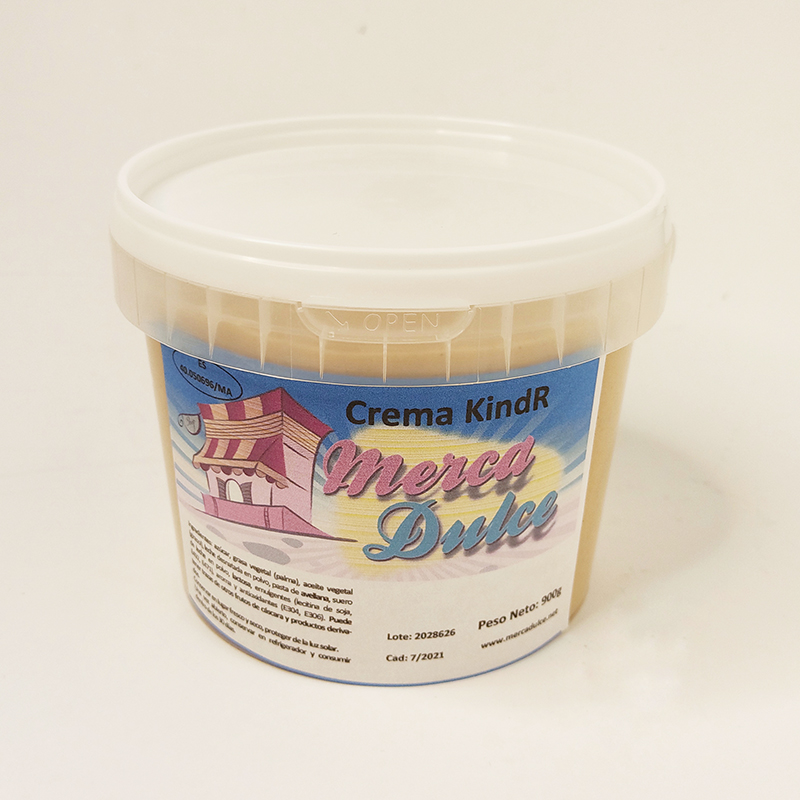Ingredientes: azúcar, grasa vegetal (palma), aceite vegetal (girasol), leche desnatada en polvo, pasta de avellana, suero de leche en polvo, lactosa, emulgentes (lecitina de soja, E492, E471), aroma y antioxidantes (E304, E306). Puede tener trazas de otros frutos de cáscara y productos derivados.