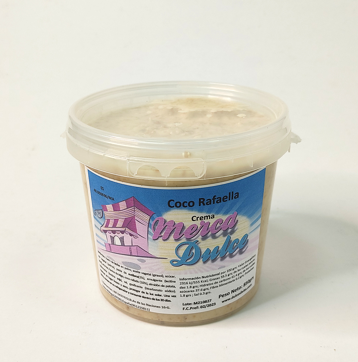 Ingredientes: azúcar, aceite vegetal (girasol), leche desnatada en polvo, pasta de avellana, suero de leche en polvo, emulgentes (lecitina de girasol), aromas, coco rallado (10%), harina de trigo, almidón de patata, emulsionante (lecitina de soja), sal, gasificante (bicarbonato sódico). Puede tener trazas de otros frutos de cáscara y productos derivados.