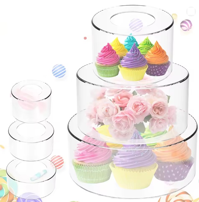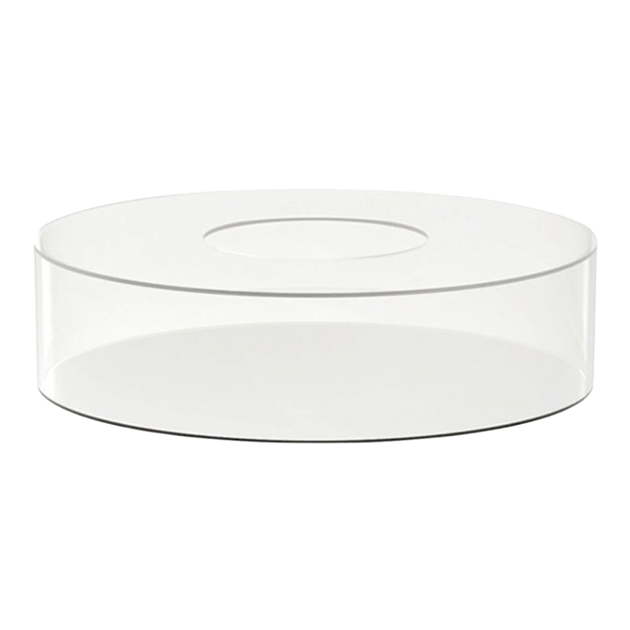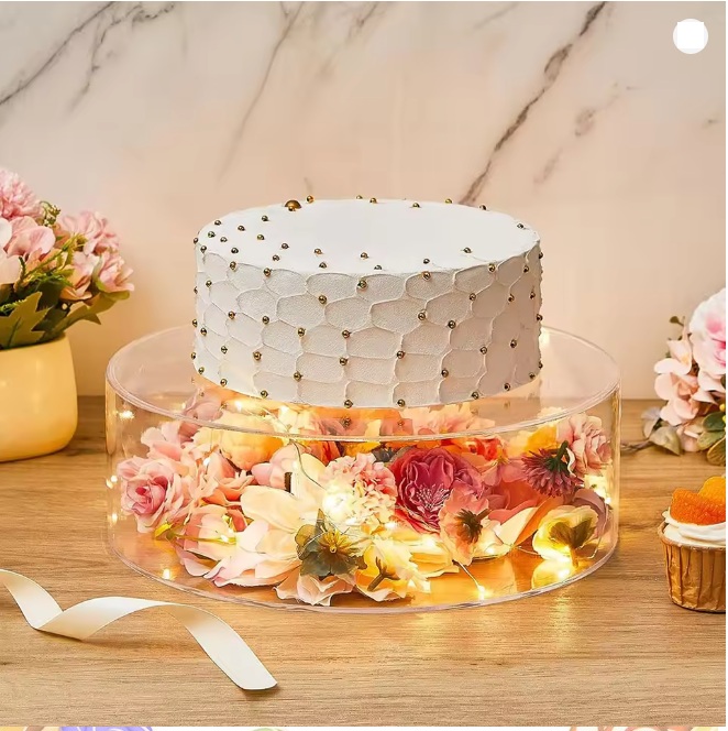Soporte circular acrílico transparente para crear tartas de varios pisos, ideal para introducir decoraciones en su interior.