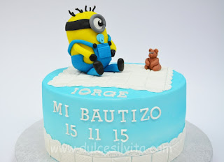 Seguro que Jorge será tan fan de los Minions como su madre… por eso su tarta tenía este simpático personaje con su chupete y su osito de peluche 😉
