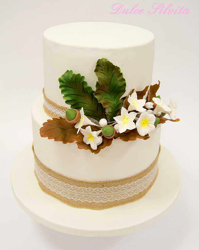 Para una boda muy íntima esta delicada tarta con motivos otoñales, en el interior mucho chocolate con relleno de frambuesas
