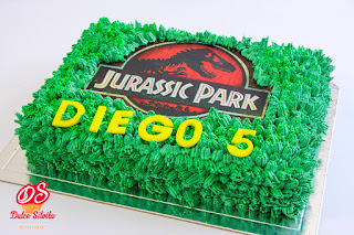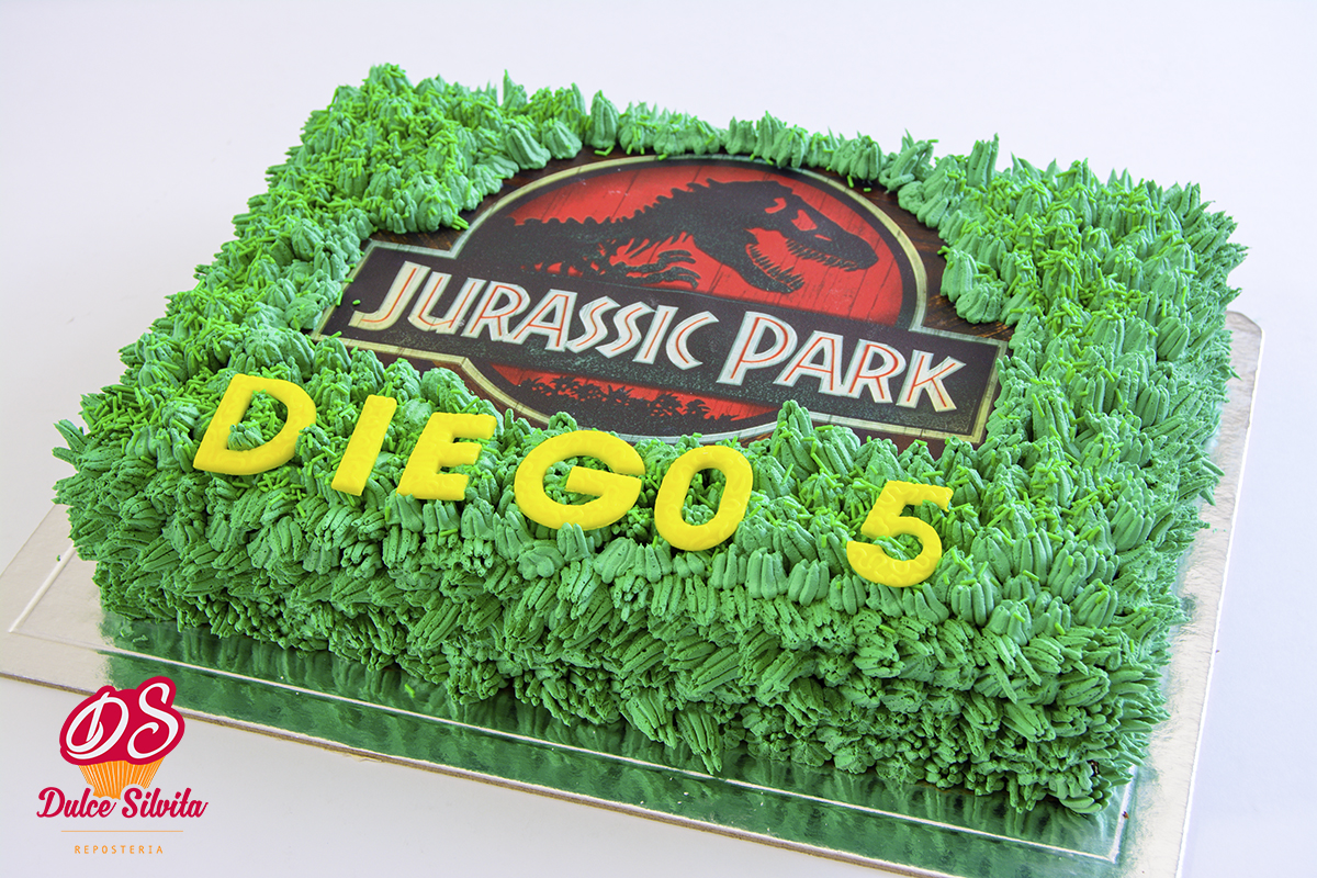Le encantan los dinosaurios y no podía faltar el logo de Jurassic Park para decorar su tarta.