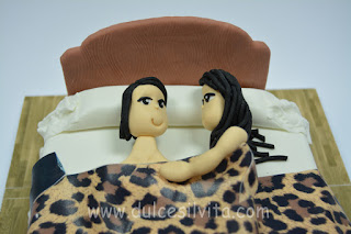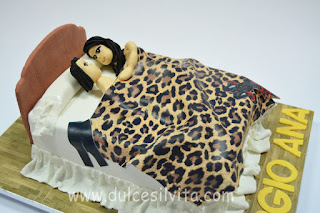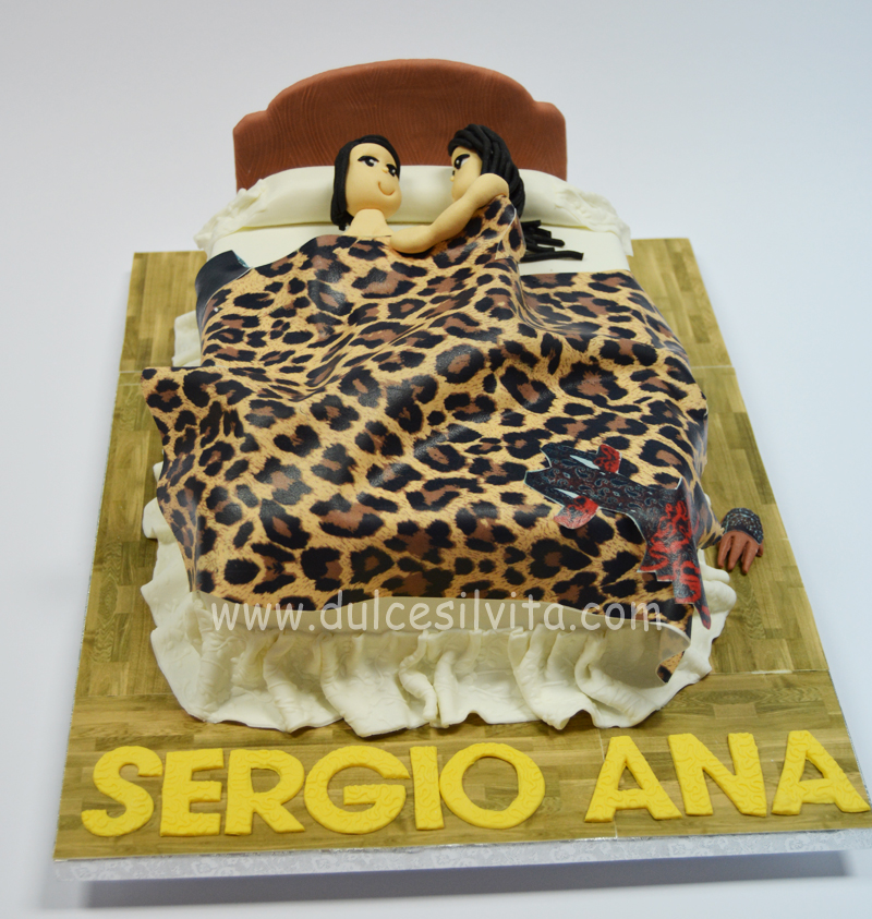 Una tarta muy explicita para estos novios 😉 Sábanas de leopardo, ropa revuelta y dos caritas de enamorados ..