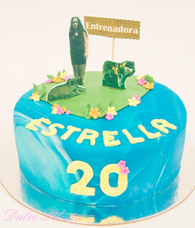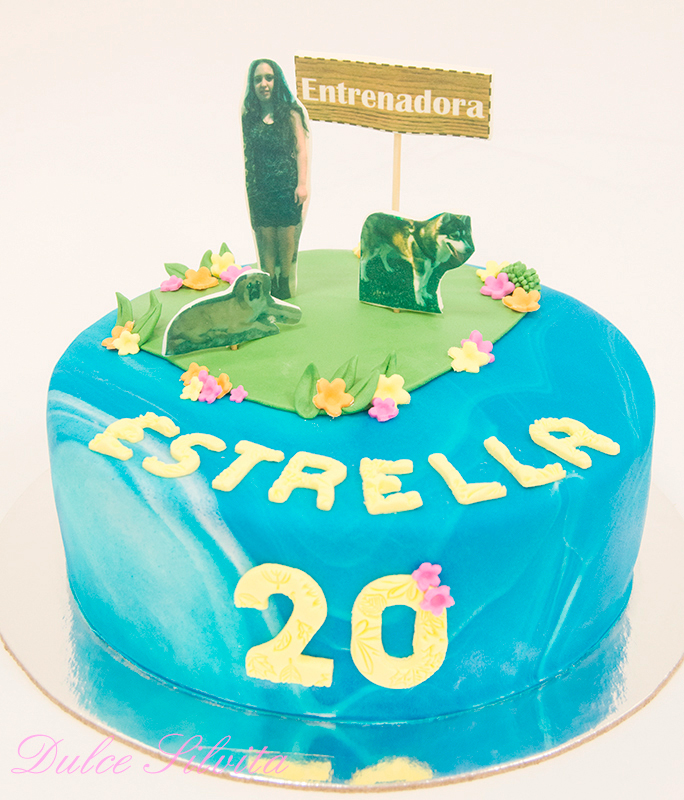 Jezabel quería regalarle a su hija una tarta que representara lo que más le gusta y por eso nos pidió que estuvieran sus perros y el cartel de Entrenadora que es a lo que se dedica.