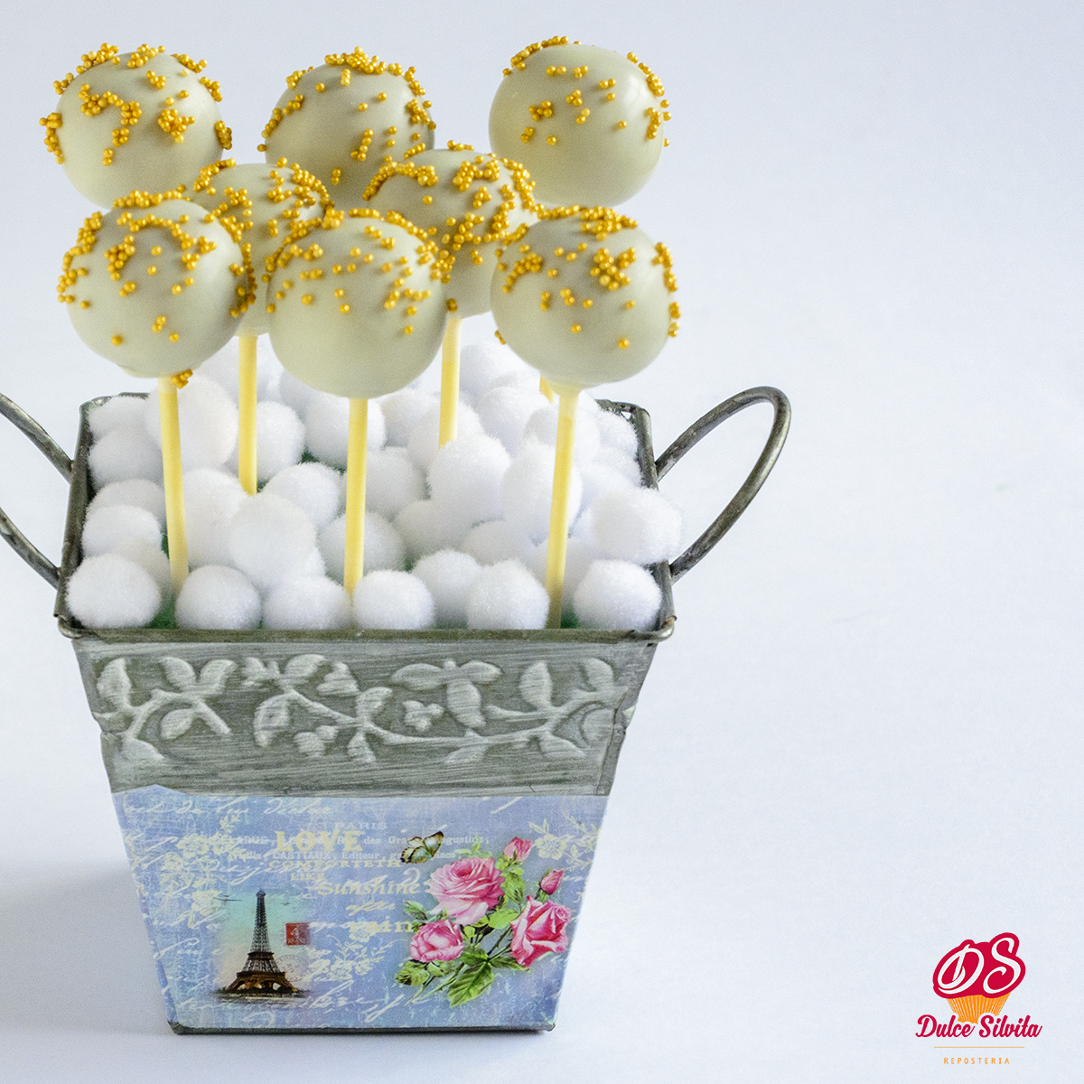Los padres de Paula nos pidieron la tarta y los cakepops a juego con la decoración de la fiesta, todo sería en Oro y Blanco.